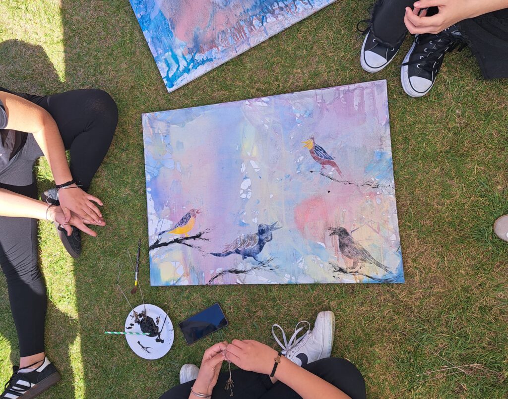 U drugom dijelu radionice, učenici su u ambijentu lapidarija Muzeja, obogaćenom zvukovima prirode, svoje dojmove pretočili u umjetnost. Kroz individualni i skupni rad, motive ptica izrađivali su grafičkom tehnikom linoreza, otiskujući ih na platna koja su prethodno oslikali u duhu apstraktnog ekspresionizma – nastojeći pritom vizualno dočarati ptičji pjev i kretanje.